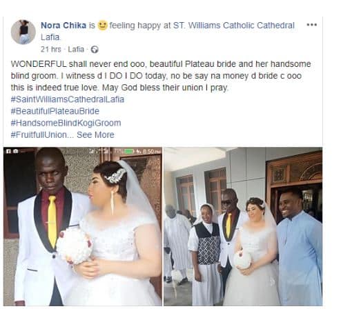 “WONDERFUL shall never end ooo, beautiful Plateau bride and her handsome blind groom. I witness d I DO I DO today, no be say na money d bride c ooo this is indeed true love. May God bless their union I pray.”